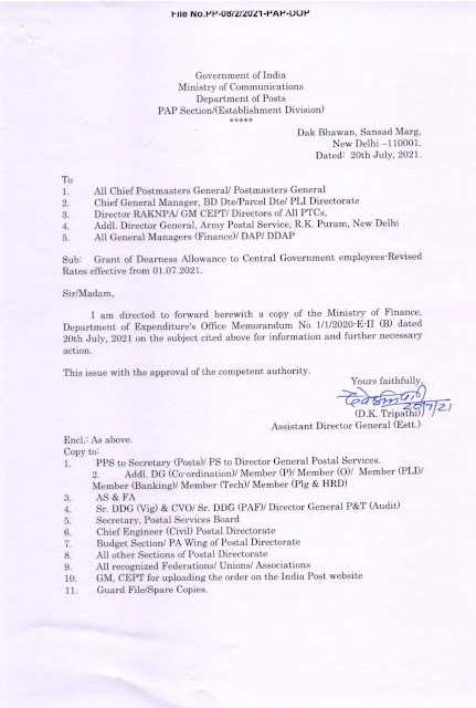 Grant of Dearness Allowance to Central Government Employees - Revised Rates effective from 01/07/2021 - Department of Posts Order