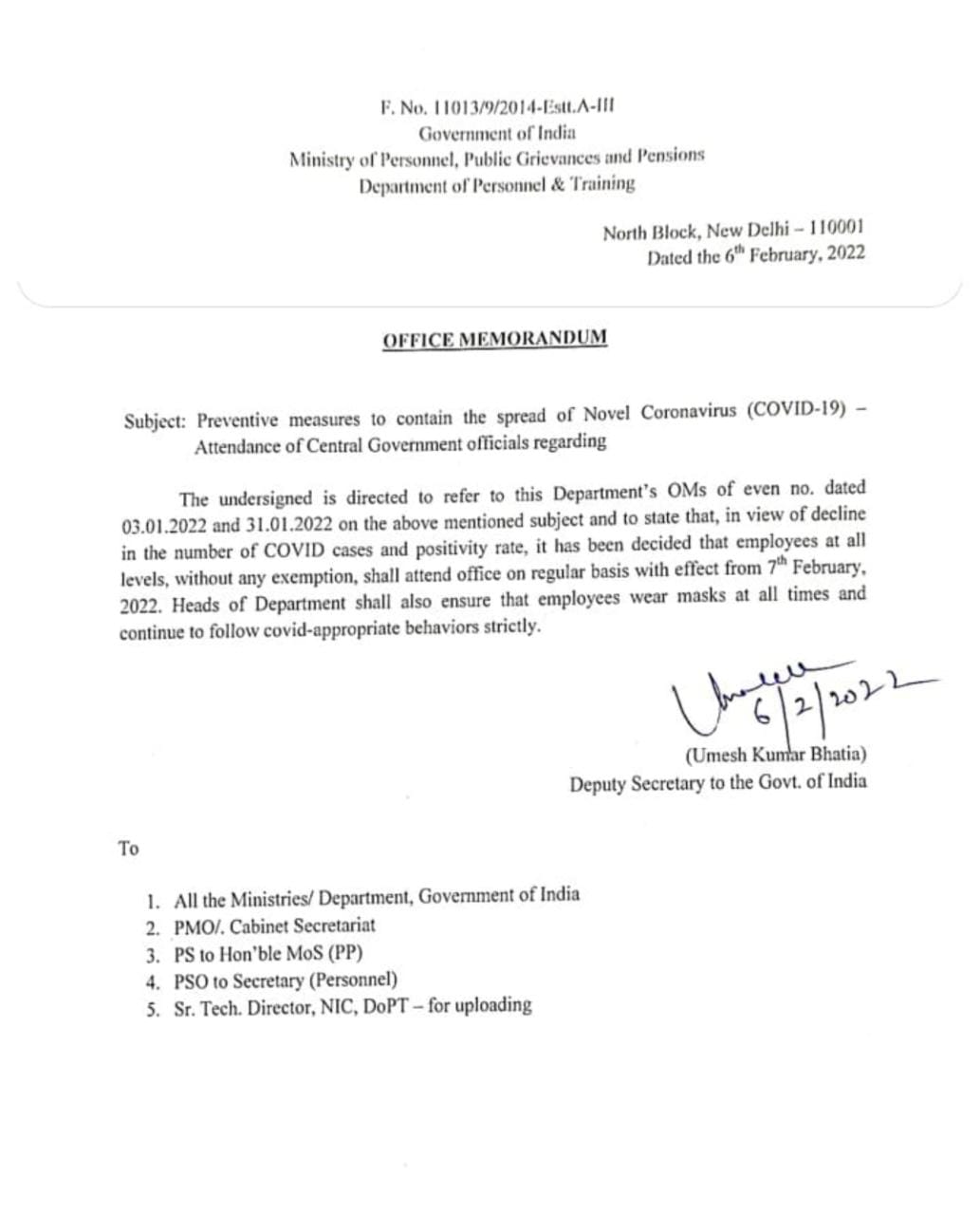 Preventive measure to contain the spread of COVID-19 : Attendance of Central Government officials regarding